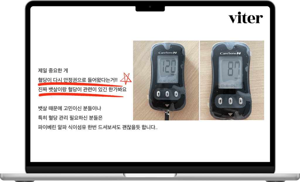 “집안에 당뇨 내력이 있어서, 신경 쓰고 있었는데 파이베린 알파 식이섬유를 알게 됐어요. 베르베린 성분도 들어있다길래 먹어봐야겠다 싶어서 구매했는데요. 먹기 시작했을 땐 화장실 가는 게 좀 편해진 정도였는데, 2주 지나니까 배가 들어가는 게 느껴지더라고요. 한 달쯤 되니까 남편이 배 들어갔다고 하고, 허리둘레 재봤더니 3센치나 줄어 있었어요. 무엇보다 혈당도 다시 안정권으로 들어왔고요!” — 실제 파이베린 식이섬유 사용자 후기